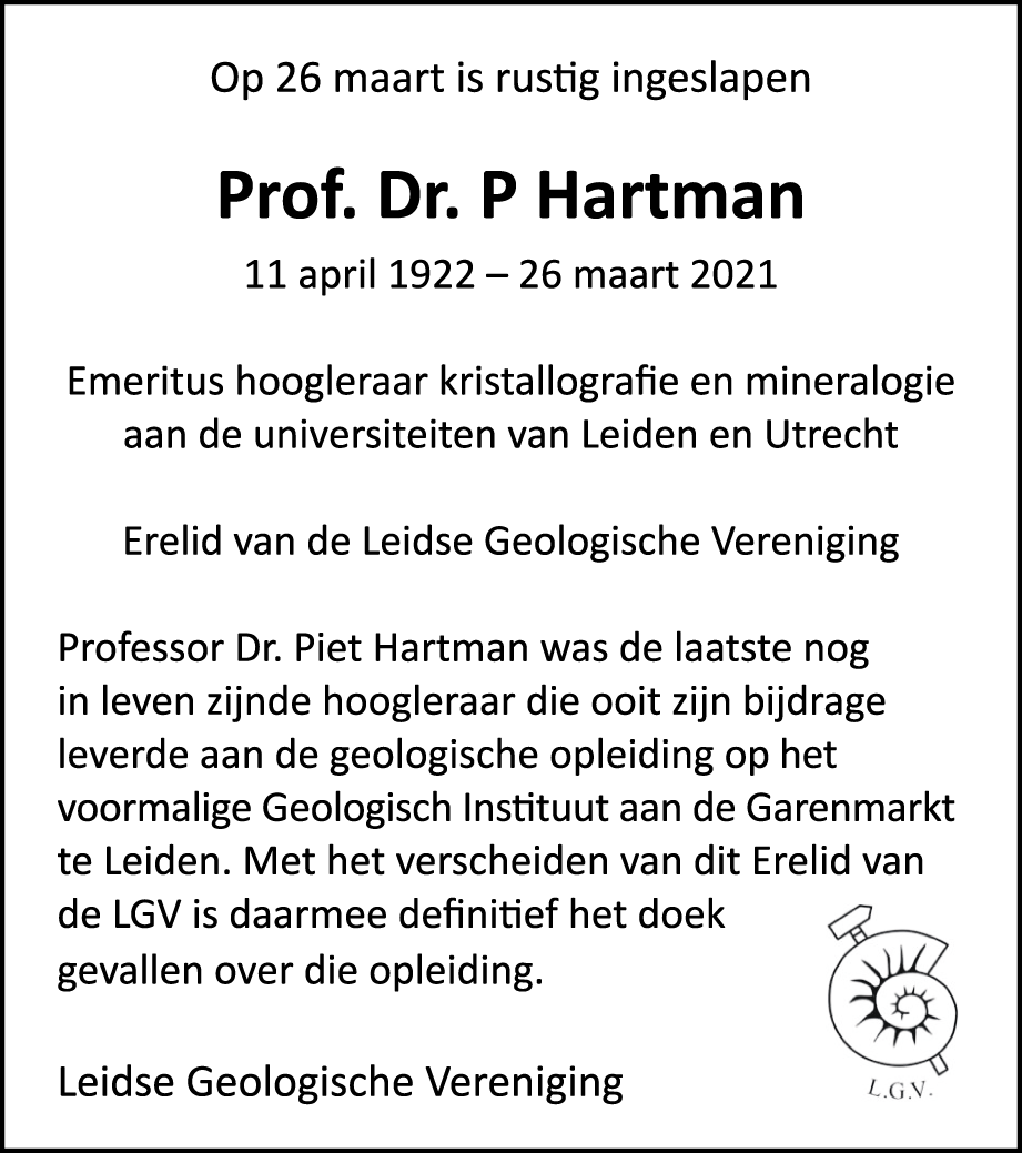 Tot mijn spijt moet ik u berichten dat Professor Hartman, Piet voor sommigen van u, 26 maart (2021) overleden is.