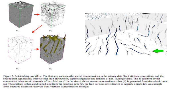 Mieren hebben ondanks hun beperkte individuele denkraam als groep een heel effectieve boerenslimheid. Sommige soorten zijn tenminste in staat om, als een individuele mier een voedselbron heeft gevonden, de informatie over de plaats waar dat voedsel zich bevindt aan hun collega werkmieren over te dragen. Binnen de kortste keren loopt er dan een spoor van mieren naar de voedselbron en wordt dat eten door de kolonne naar het nest teruggebracht. Dit groepsgedrag wordt in het Engels ‘ant tracking’ genoemd. ‘Ant tracking’ is ook de naam van een seismische interpretatie techniek om bijvoorbeeld breuken in de ondergrond in detail te karteren. De onderstaande illustratie met bijschrift geeft aan hoe die methode werkt. Kort samengevat komt het er op neer dat de interpretator met een muisklik aangeeft welk soort signaal in een 3D seismisch pixelbestand een bepaalde geologische karakteristiek – bijvoorbeeld een breuk – weergeeft. Die pixel krijgt dus een soort etiket. In mierentaal gezegd: dit is een lekker hapje De software doorzoekt dan het hele 3D-bestand op pixels met dezelfde eigenschappen, en rijgt die zoveel mogelijk aan elkaar als een kralensnoer. Zo’n pixelsnoer is analoog aan het spoor dat mieren langs voedselbronnen volgen. Met andere woorden: zo’n pixelsnoer is een ‘ant track’. De andere pixels worden daarna onzichtbaar gemaakt op het computerscherm en de aaneengeregen pixel snoeren of ‘ant tracks’ geven de plaats van breuken heel nauwkeurig weer.