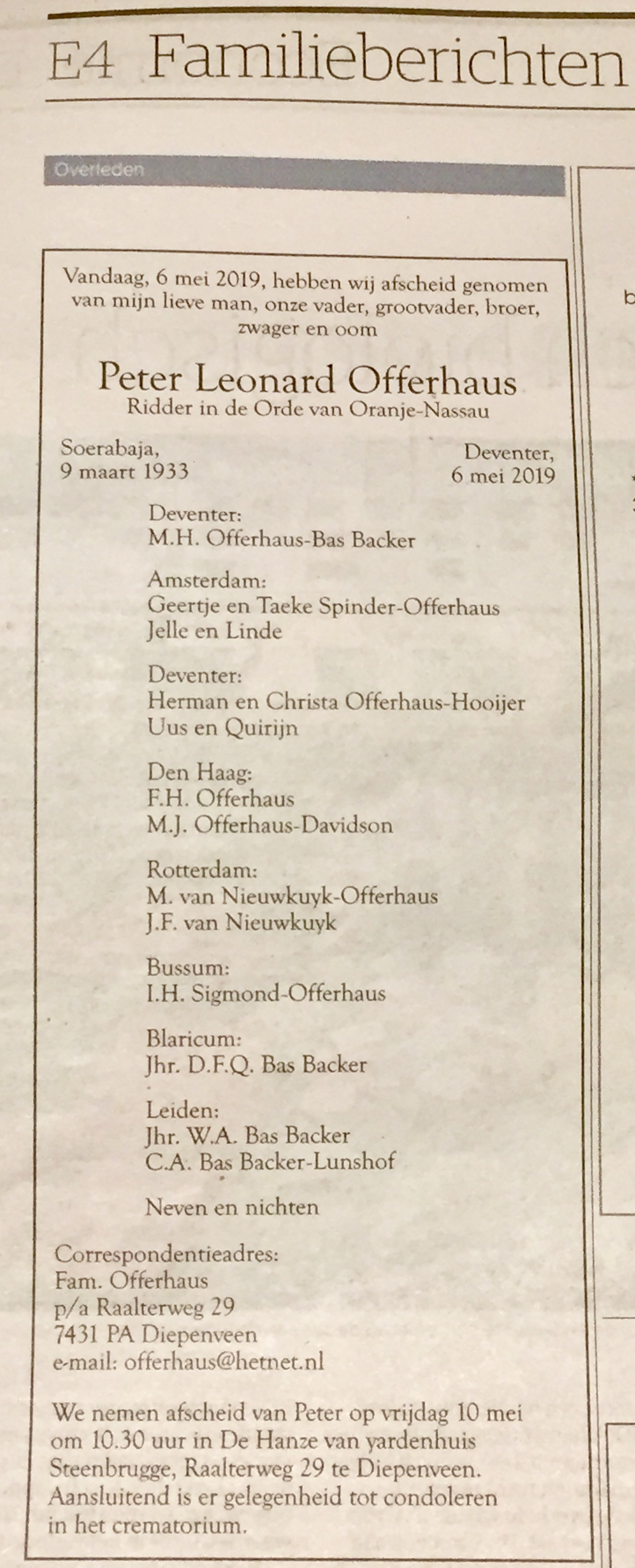 Op vrijdag 10 mei wordt afscheid genomen van Peter Offerhaus (zie bijgesloten Overlijdensadvertentie voor detail).